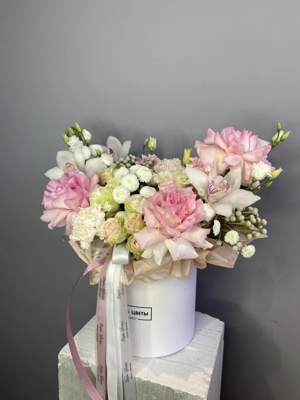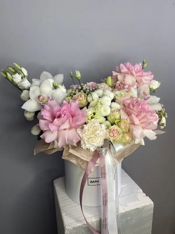 • Состав: Коробочка содержит роскошные цветы в гармоничном составе .