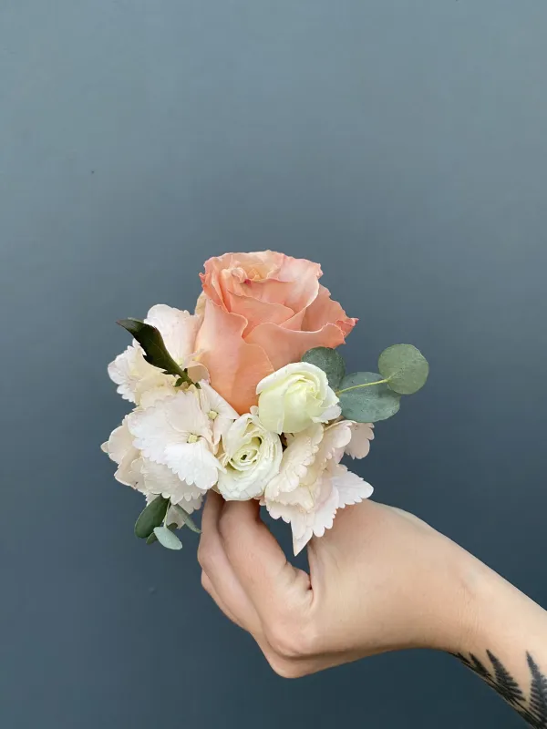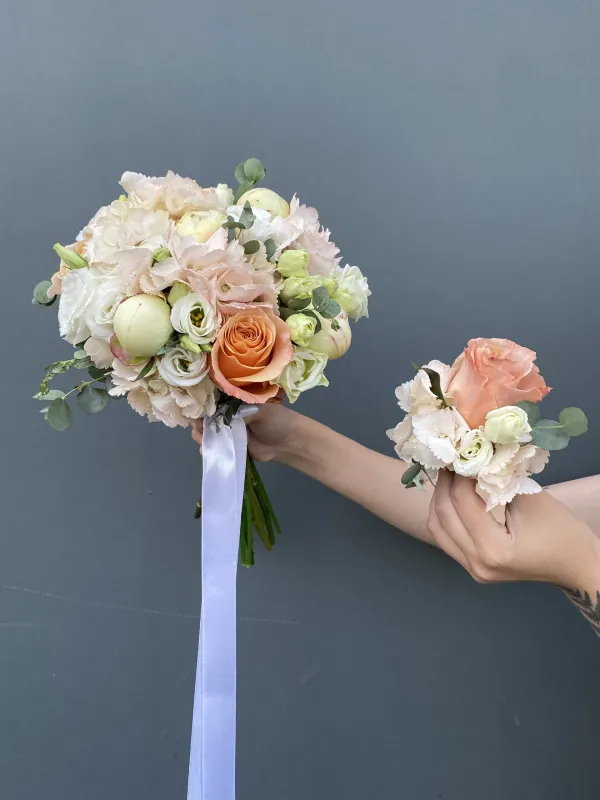 Свадебная пара букет невесты и бутоньерка жениха с закрытыми пионами, гортензией, розами, эустомой и веточками эвкалипта №18